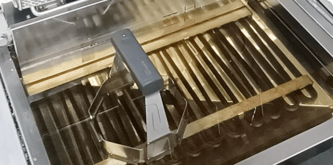 IH調理機器+循環フィルター式脱油機能をワゴンに収納。移動しやすいコンパクトボディを実現し、お客様のそばに移動して調理の演出ができます。