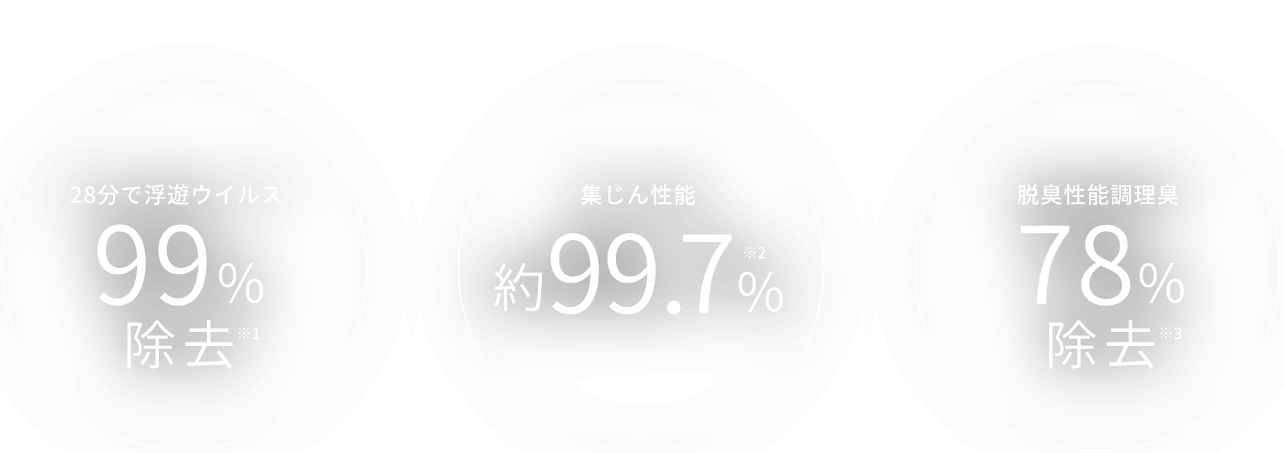 ※1約6 畳(25m³)の試験室内での効果です。実空間での実証結果ではありません。【試験機関】(一財)北里環境科学センター【試験方法】試験室(25m³)において 1 種類のウイルスを浮遊させ空気中のウイルス数を測定【試験機運転条件】型番:CoCoCLEAN(OSMCO-S02) をLOW で運転。OSMCO-S02 のLOW はOSMCO-S03 のMID と同等の性能(300m³/h)。【試験結果】28分で 99%除去。( 北生発 2020_0495 号 ) ※2 準HEPA フィルターを使用。(0.3μmの粒子に対して、捕集率99.7%以上)また一般的なウイルスの直径は0.3㎛よりも小さいため、捕集率はこれよりも下がります。  ※3 数値は脱臭効率を表しており、フィルターに入る前とフィルターを出た後のニオイを比較した際のニオイの低減率を示すものです。(二点比較式臭気法により測定。脱臭効率約78%)部屋・空間全体の脱臭性能とは異なります。(当社規定の試験方法により測定。焼肉用牛バラカルビ肉200g・唐揚げ10個での調理試験)