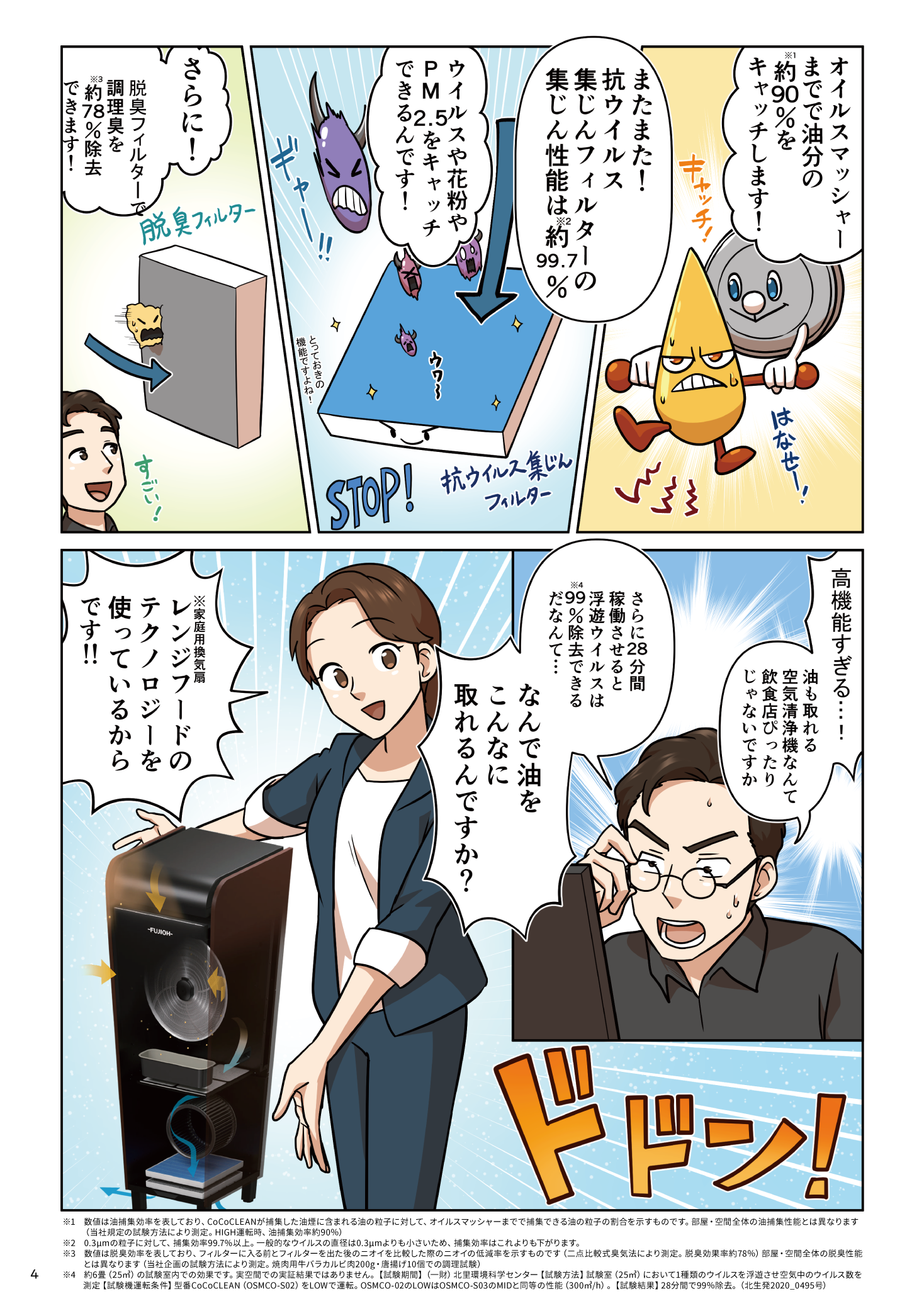 ※1 数値は油捕集効率を表しており、CoCoCLEANが捕集した油煙に含まれる油の粒子に対して、オイルスマッシャーまでで捕集できる油の粒子の割合を示すものです。部屋・空間全体の油捕集性能とは異なります。(当社規定の試験方法により測定。HIGH運転時油捕集効率約90%)。