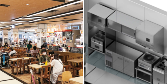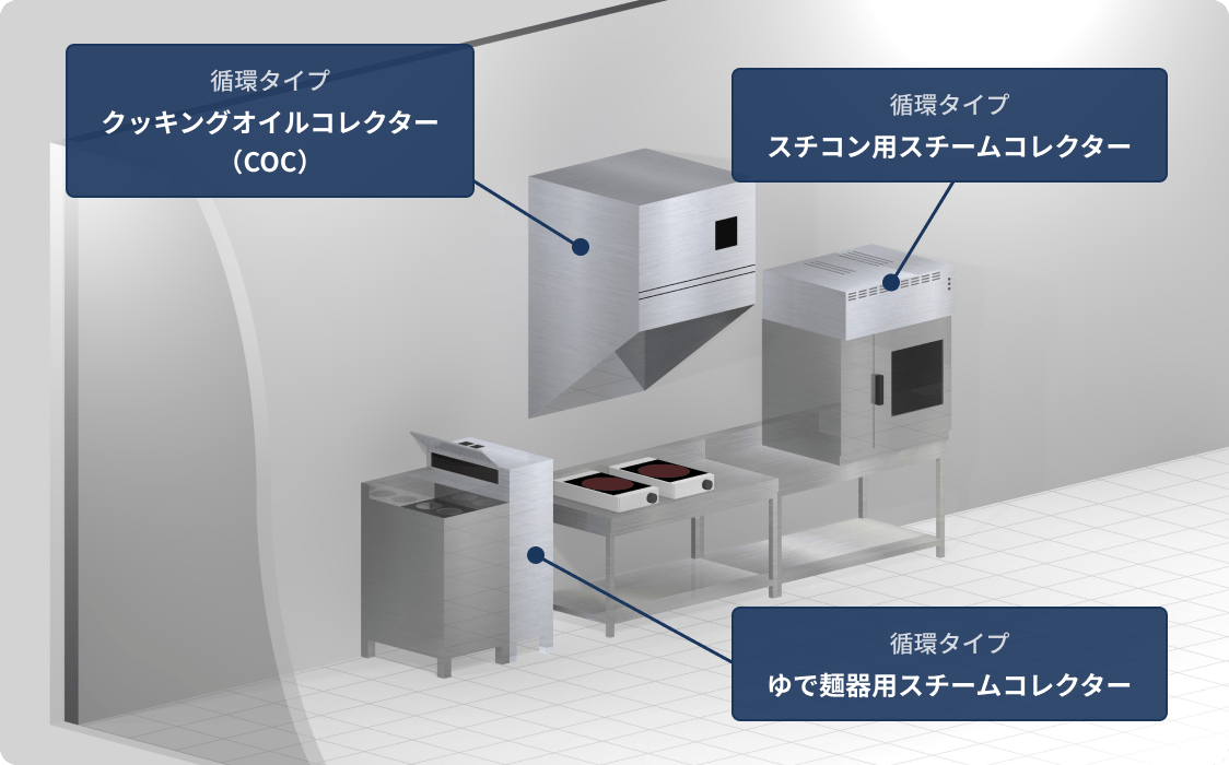 - 大型商用施設でテナントに割り当てられた排気風量が足りなくても、加熱調理器の一部を「循環タイプ」と組み合わせることで解決
