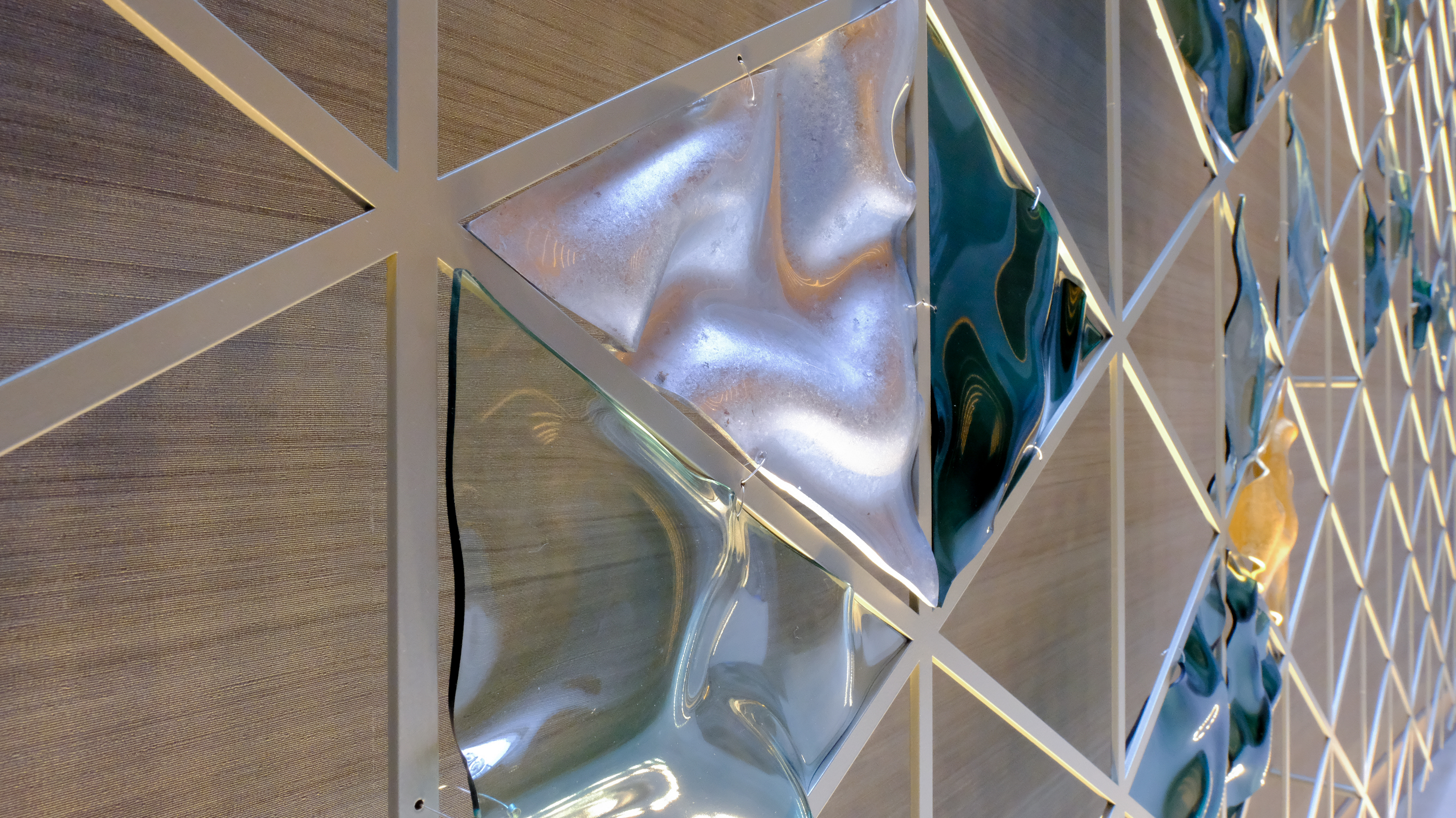 レーザーによる微細加⼯で⾦属表⾯に精密なパターンを与え、構造精度と建築的意匠を両⽴する技術。美しい⾒え⽅を実現するために、切断にとどまらず光や影、パネルの重なり⽅まで徹底的に構想を重ね、設計する。