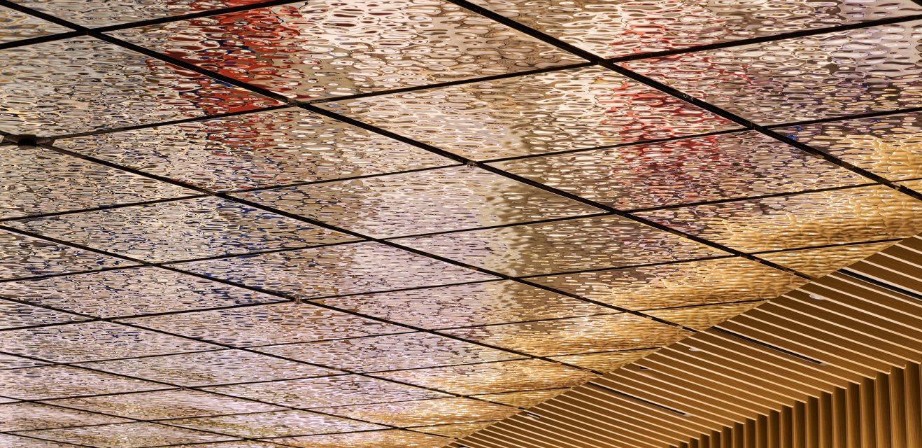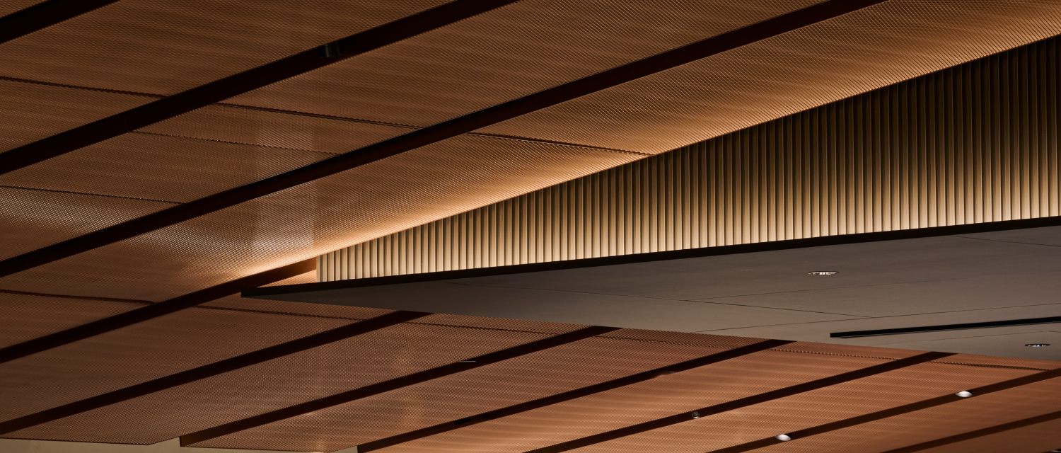設計者のイメージを⾦型へ精密に落とし込み、⾦属プレスにより薄板⾦属へ⽴体的に転写する⾃在成形を採⽤。板⾦設計と組み合わせ、意匠性‧⼨法精度•施⼯性を⾼次元で両⽴し、光と影による質感表現で空港空間の完成度を⾼めた。⼤空間に求められる象徴性と耐久性を同時に満たす天井パネルを実現している。
